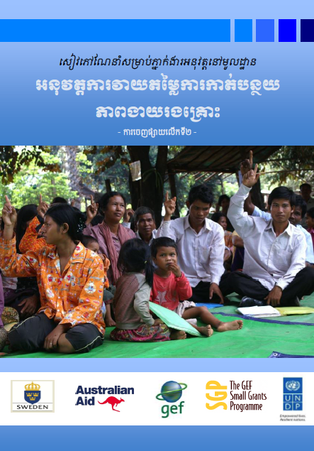 ឆ្នាំបោះពុម្ភផ្សាយ៖ ២០១៥ / ប្រភពៈ យូអិនឌីភីសៀវភៅណែនាំនេះមានតួនាទីជាការណែនាំដល់ភ្នាក់ងារអនុវត្តការងារបន្សាំុនឹងការប្រែប្រួលអាកាសធាតុ ស្ថាប័នផ្តល់ជំនួយ អង្គការមិនមែនរដ្ឋាភិបាល អង្គការសហគមន៍មូលដ្ឋាន ស្ថាប័នរដ្ឋាភិបាលនិងអ្នកផ្តល់សេវាកម្មផ្នែកអភិវឌ្ឍន៍ ដើម្បីគាំទ្រភ្នាក់ងារ និងស្ថាប័នទាំងនោះ នៅក្នុងការអនុវត្តវិធីសាស្រ្តវាយតម្លៃការកាត់បន្ថយភាពរងគ្រោះ និងការរៀបចំគម្រោងកាត់បន្ថយភាពងាយរងគ្រោះនៃការប្រែប្រួលអាកាសធាតុ ដែលឆ្លុះបញ្ចាំងពីតម្រូវការរបស់សហគមន៍។