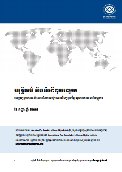 ឆ្នាំបោះពុម្ភផ្សាយ៖ ២០១៥ / ប្រភពៈ វិទ្យាស្ថានសិទ្ធិមនុស្សនៃគណៈមេធាវីអន្តរជាតិរបាយការណ៍េនះ ជាលទ្ធផលនៃដំេណើរទស្សនកិច្ច ការស្រាវជា្រវ និងបទសមា្ភសជាបន្តបនា្ទប់ បានពិនិត្យជាដំបូងលើឯករាជ្យភាពនៃប្រព័ន្ធតុលាការ និងសន្និដ្ឋានថា រដ្ឋមន្រ្តីក្រសួងយុត្តិធម៌កម្ពុជាបានទទួលតួនាទីដ៏មានអំណាចបំផុតទាំងផ្លូវច្បាប់ និងការអនុវត្តជាក់ស្តែង ក្នុងប្រព័ន្ធយុត្តិធម៌ និងមានឆនា្ទនុសិទ្ធិ និងឥទ្ធិពលលើផ្នែកស្ទើរតែទាំងអស់របស់ចៅក្រម ។