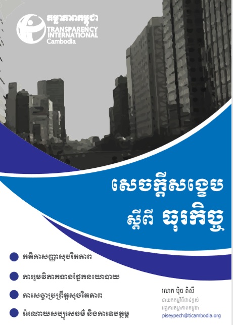 សេចក្តីសង្ខេបស្តីពីធុរកិច្ចរបស់កម្មវិធីពង្រឹងសុចរិតភាពធុរកិច្ចអង្គការតម្លាភាពកម្ពុជា ផ្ទុកនូវព័ត៌មាន សំខាន់ៗជាច្រើនសម្រាប់ក្រុមហ៊ុន សហគ្រាស និងវិស័យជននានា ក្នុងការលើកកម្ពស់គោលនយោបាយ សុចរិតភាពក្នុងវិស័យធុរកិច្ច។ ចាប់អារម្មណ៍ចង់ដឹងបន្ថែមពីគោលនយោបាយស្តីពី អំណោយ និង បដិសណ្ឋារកិច្ច ការរាយការណ៍ ការផ្តល់ប្រាក់សម្រាប់ការសម្របសម្រួល និងទំនាស់ផលប្រយោជន៍ដែររឺទេ? សេចក្តីសង្ខេបស្តីពីធុរកិច្ច មិនត្រឹមតែអាច ពន្យល់ពីសារសំខាន់នៃគោលនយោបាយទាំងនោះទេ ថែមទាំងផ្តល់នូវចំនុចស្នូលដែលគួរតែបញ្ចូលក្នុងគោល នយោបាយធុរកិច្ចទៀតផង។ សរុបមក សេចក្តីសង្ខេបស្តីពីធុរកិច្ច ឆ្លុះបញ្ចាំងពីគោលនយោបាយសំខាន់ៗ ចំនួន ៤ ដែលគ្រប់សារជីវកម្មគួរតែមាន លើសពីនេះទៀត វាក៏បានបង្ហាញពីប្រសិទ្ធិភាពរបស់គោលនយោបាយ និងក្របខ័ណ្ឌនានាក្នុងគោលការណ៍ផ្ទៃក្នុងរបស់សារជីវកម្មនោះ។ ប្រសិនបើលោកអ្នកចាប់អារម្មណ៍ក្នុងការ ទទួលបានសៀវភៅសេចក្តីសង្ខេបនេះ សូមធ្វើការទំនាក់ទំនង់មកកាន់យើងខ្ញុំ តាមរយៈ pidorchhay@ticambodia.org