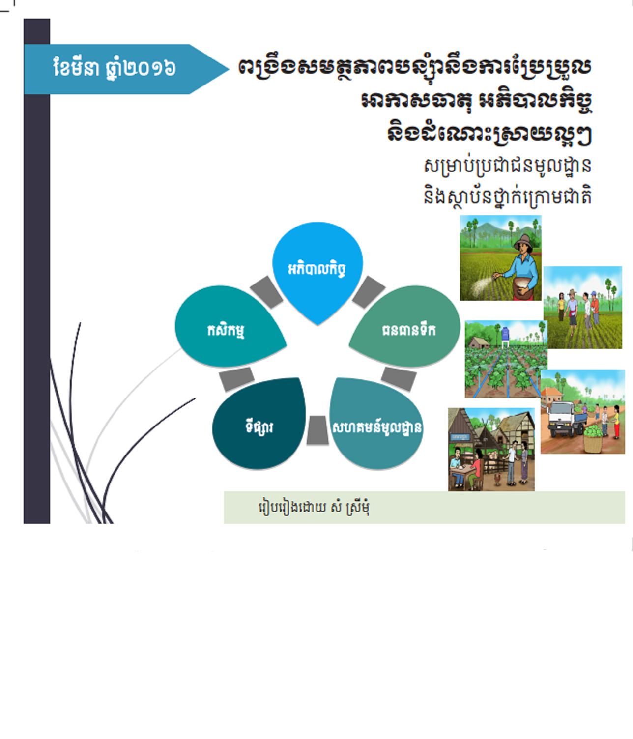 ឯកសារនេះគឺជាការសិក្សាអំពីការប្រែប្រួលអាកាសធាតុ និងសកម្មភាពមនុស្សដែលជះឥទ្ធិពលដល់ធនធានទឹក ភាពងាយរងគ្រោះទៅនឹងការប្រែប្រួលអាកាសធាតុ និងអភិបាលកិច្ចធនធានទឹក ព្រមទាំងលើកឡើងពីវិធីសាស្រ្តក្នុងការពង្រឹងអភិបាលកិច្ច និងវិធីសាស្រ្តបន្សាំុសម្រាប់ធនធានទឹក។