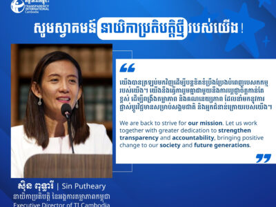 យើងមានសេចក្តីសោមនស្សរីករាយយ៉ាងខ្លាំងក្នុងការស្វាគមន៍លោកស្រី ស៊ិន ពុទ្ធារី ចូលរួមជាមួយ អង្គការតម្លាភាពកម្ពុជា (TI Cambodia) ក្នុងតួនាទីជា នាយិកាប្រតិបត្តិ ។ លោកស្រី ស៊ិន ពុទ្ធារី មានបទពិសោធន៍ដឹកនាំជាច្រើនក្នុងវិស័យសង្គមស៊ីវិលនៅកម្ពុជា ដោយមានជំនាញក្នុងការដឹកនាំ ការតស៊ូមតិ ការចូលរួមរបស់ភាគីពាក់ព័ន្ធ និងការអភិវឌ្ឍស្ថាប័ន។ នៅក្នុងតួនាទីជានាយិកាប្រតិបត្តិ លោកស្រីនឹងដឹកនាំគោលដៅយុទ្ធសាស្ត្ររួមរបស់អង្គការតម្លាភាពកម្ពុជា ពង្រឹងការគ្រប់គ្រងស្ថាប័ន ជំរុញភាពជាដៃគូ... Read More