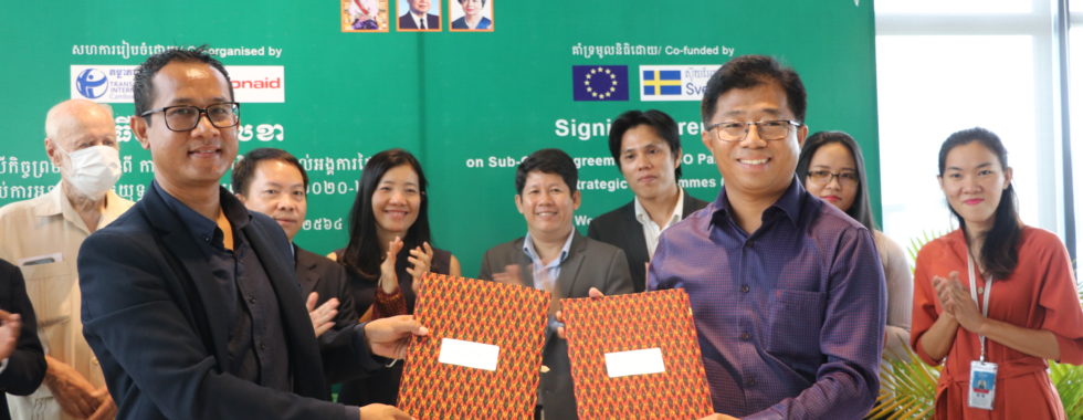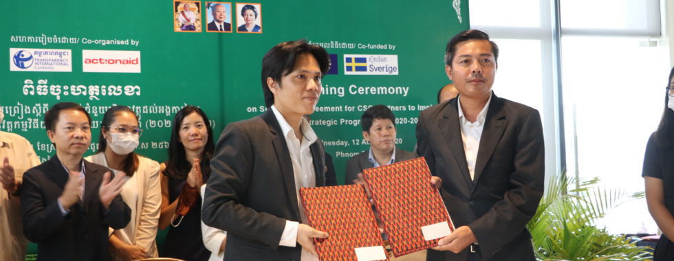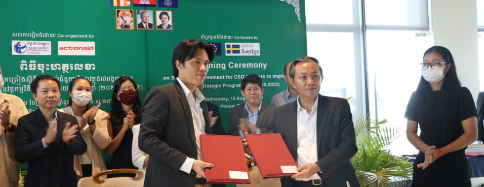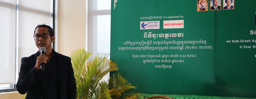 រាជធានីភ្នំពេញ ថ្ងៃទី១២ ខែសីហា ឆ្នាំ២០២០ – អង្គការតម្លាភាពកម្ពុជា និងអង្គការអាក់សិនអេតកម្ពុជា បានប្រារព្ធពិធីចុះហត្ថលេខាលើកិច្ចព្រមព្រៀងផ្ដល់ជំនួយហិរញ្ញវត្ថុដល់អង្គការដៃគូ ដើម្បីអនុវត្តកម្មវិធីយុទ្ធសាស្រ្តរយៈពេល៣ឆ្នាំ (២០២០-២០២២)។ នៅក្នុងពិធីចុះហត្ថលេខានេះ អង្គការតម្លាភាពកម្ពុជា និងអង្គការអាក់សិនអេតកម្ពុជា បានចុះហត្ថលេខាលើកិច្ចព្រមព្រៀងផ្ដល់ជំនួយហិរញ្ញវត្ថុដល់អង្គការដៃគូអនុវត្តគម្រោងសរុបចំនួន ៩ស្ថាប័ន ដែលនឹងរួមចំណែកនៅក្នុងការអនុវត្តកម្មវិធីយុទ្ធសាស្ត្រនេះ។